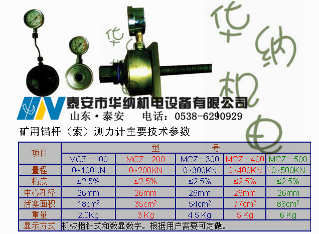MCZ矿用锚杆锚索测力计技术参数:工作压力:0~60MPa;外径:120mm;内径:105mm;中心孔径:24mm;分辨率:0.1MPa;工作液:3#黄油;压力表等级:2.5级;重量:3.2Kg。