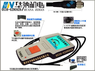 HYZT型岩层钻孔探测仪。岩层钻孔探测仪(2方向转头),采用数字式视频成象原理,5.5mm直径探头自带光源大屏幕液晶显示屏清晰成像,结构小巧方便携带。现场可由多人观看并可拍照/摄像/储存并输出图片或视频。可广泛用于煤矿岩层钻孔探测,便于巷道围岩超前支护,同时可广泛应用于桥梁、隧道、建筑物、管道等隐蔽工程的内部结构观测以及工业设备零部件的内部观测。性能特点:小口径探头可轻松探测直径大于5.5毫米的孔或者掩蔽空间,宽视角摄像头可看到640×480的高分辨率图像;超轻便携,探头光源由主机提供,整机采用锂电池供电;大屏幕彩色液晶显示器,色彩显示清晰逼真;现场可多人观测,并可拍照/录像/储存,并输出图片或视频;