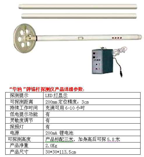 使用锚杆探测仪能迅速找到锚喷巷道混凝土喷层下金属锚杆的位置,从而可确定锚杆布置质量,以及便于凿找锚杆进行锚固力试验,为锚喷支护巷道的质量评价提供依据。该仪器还可用于其它行业探测各类非金属物体中的金属物体。