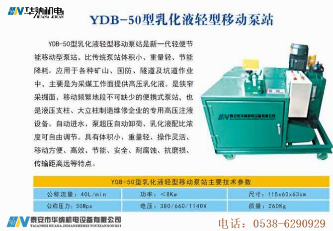用途:YDB-50型乳化液轻型移动泵站是新一代轻便节能移动型泵站。比传统泵站体积小,重量轻,节能降耗。应用于各种矿山、国防、隧道及坑道作业中,主要是为采煤工作面提供高压乳化液,是狭窄采掘面、移动频繁地段不可缺少的便携式泵站,也是液压支柱、大立柱制造维修企业的专用高压注液设备。